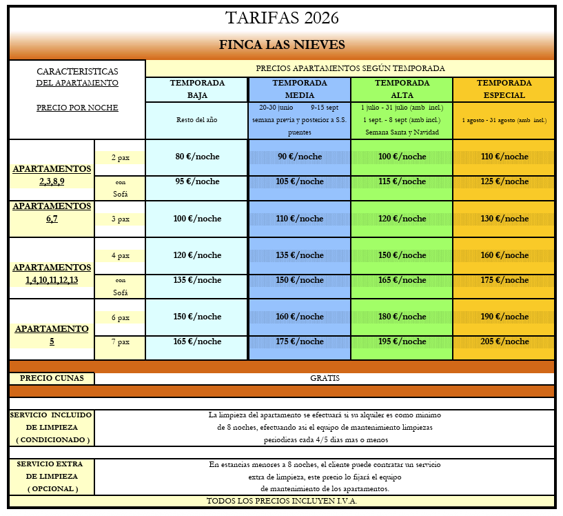 TARIFAS EN «FINCA LAS NIEVES»